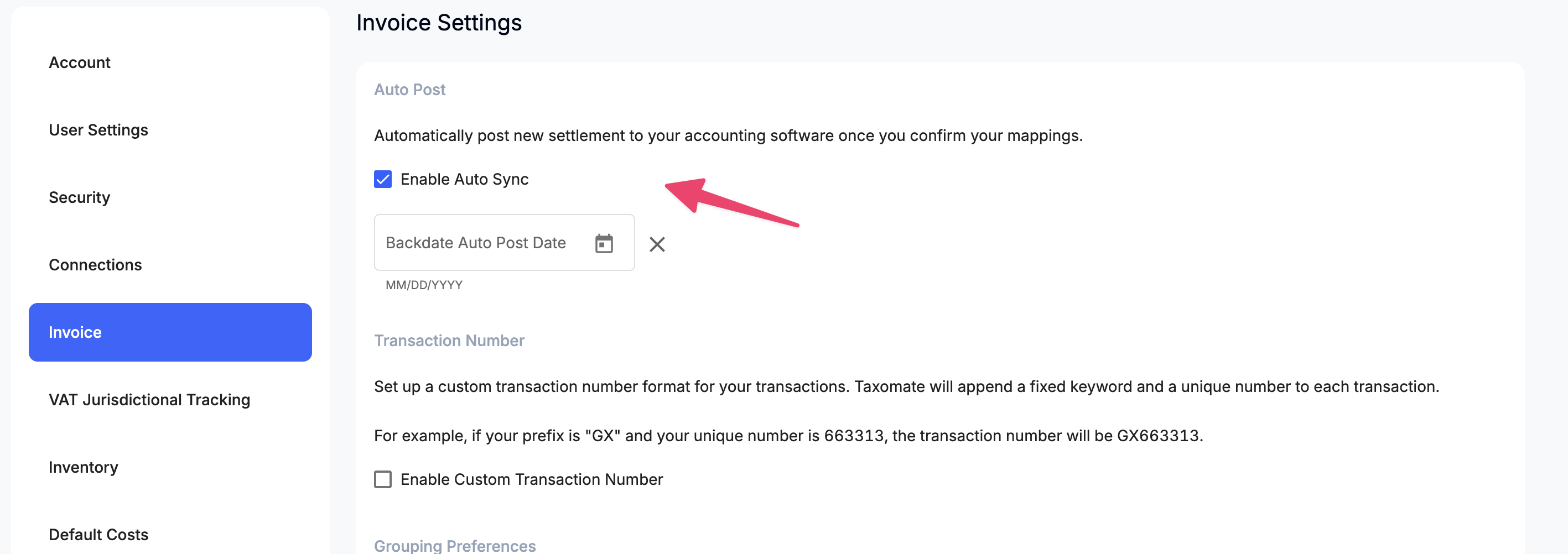 The Auto Sync toggle on the Settings → Invoice page automatically sends settlements and COGS (if enabled) starting from the time you enable it, or from a specific date you select.